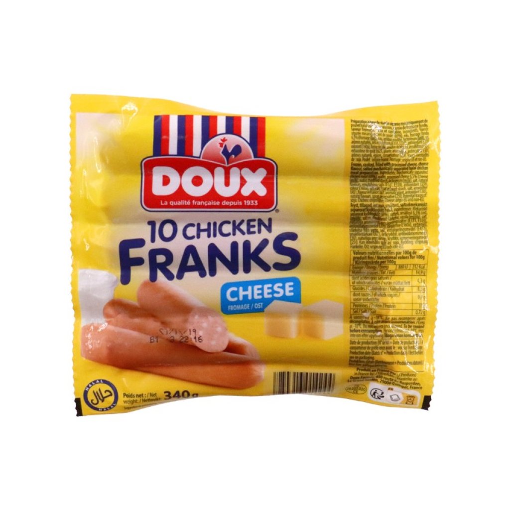 法國芝士雞肉腸(以 DOUX 寶鵰牌為代表)是香港深受歡迎的急凍小食,其特色在於將濃郁的半溶芝士塊嵌入肉質細嫩的雞肉腸中。